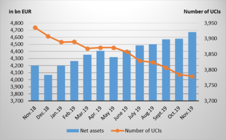 As at 30 November 2019, total net assets of undertakings for collective investment, including UCIs subject to the 2010 Law, specialised investment funds and SICARs, amounted to EUR 4,669.701 billion compared to EUR 4,577.890 billion as at 31 October 2019, i.e. a 2.01% increase over one month. Over the last twelve months, the volume of net assets rose by 11.39%.