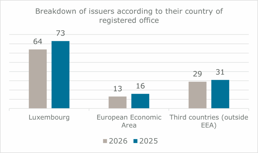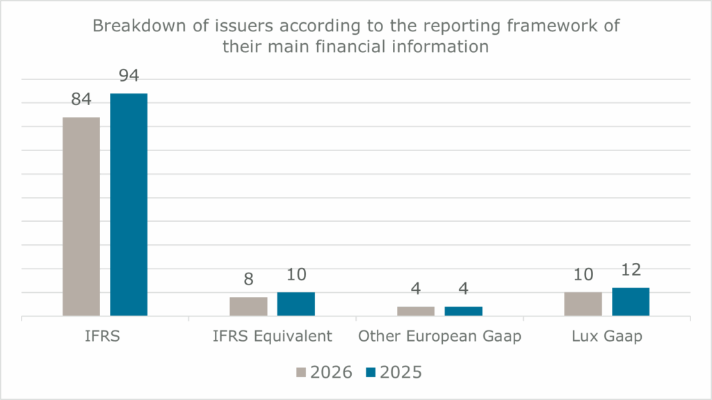 In the framework of the Transparency Law and taking into account the exemptions laid down in Article 7 of that law, the population of issuers which are subject to enforcement as at 1 January 2026 amounted to 106 entities (2025: 120) which have the following characteristics.