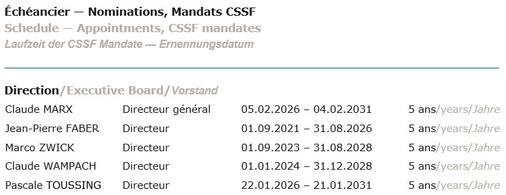 By grand-ducal decree of 23 January 2026, the mandate of Claude Marx as Director General of the CSSF was renewed for a period of five years starting 5 February 2026. This third mandate confirms the Government’s support and trust in his competences and actions.