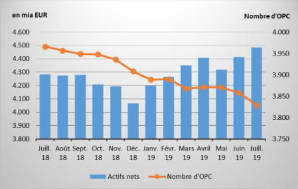 Au 31 juillet 2019, le patrimoine global net des organismes de placement collectif, comprenant les OPC soumis à la Loi de 2010, les fonds d’investissement spécialisés et les SICAR, s’est élevé à EUR 4.484,774 milliards contre EUR 4.411,388 milliards au 30 juin 2019, soit une augmentation de 1,66% sur un mois. Considéré sur la période des douze derniers mois écoulés, le volume des actifs nets est en augmentation de 4,72%.