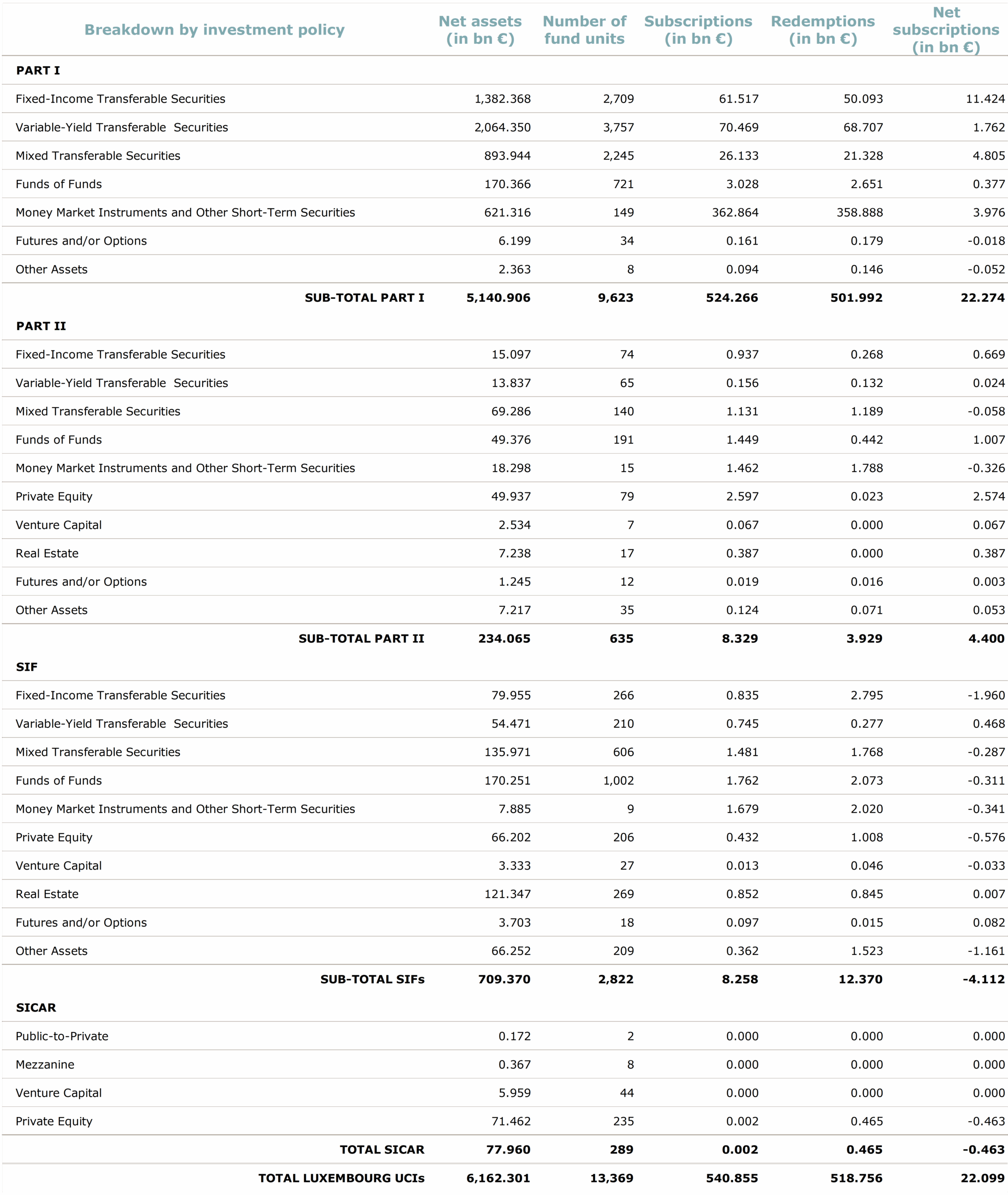 Politique d'investissement des OPC - Actifs nets ventilés par politique d'investissement et (partie de) leur loi