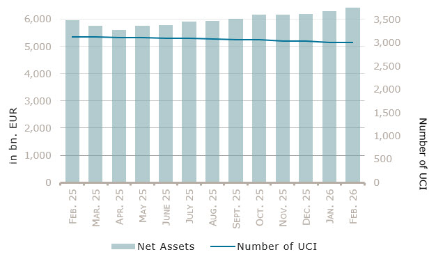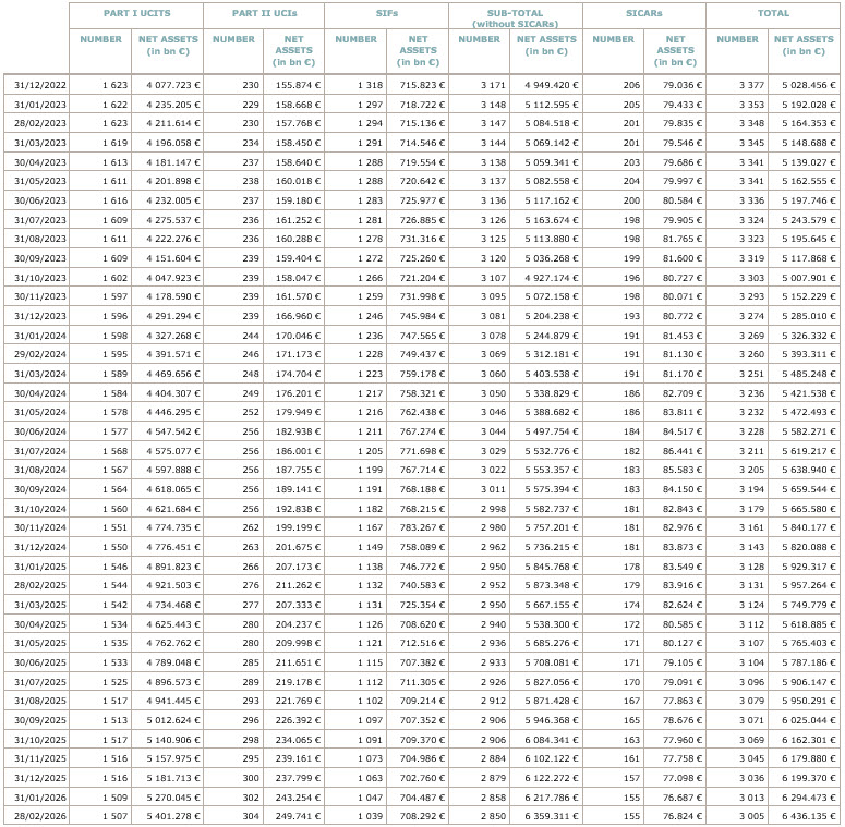 As at 28 February 2026, the total net assets of undertakings for collective investment, comprising UCIs subject to the 2010 Law, specialised investment funds and SICARs, amounted to EUR 6,436.135 billion compared to EUR 6,294.473 billion as at 31 January 2026, i.e. an increase of 2.25% over one month. Over the last twelve months, the volume of net assets increased by 8.04%.